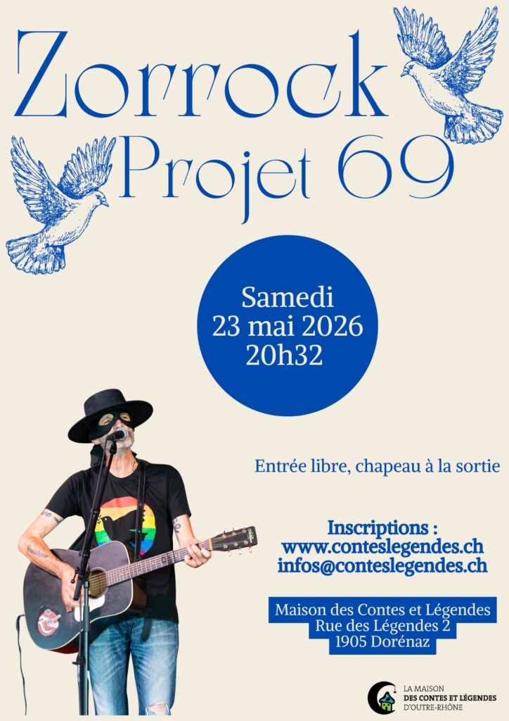 Le concert de Zorrock à la Maison des Contes et Légendes s’inscrit dans cet Esprit où la Magie opère à l’intersection entre le Rêve et la Réalité. Ancrée au Coeur de son « Projet 69 » vers La Paix, la voix douce de Zorrock nous entraîne dans des Chansons inspirées et engageantes à la découverte de Nous-mêmes, de l’Amour et du passage à l’action.